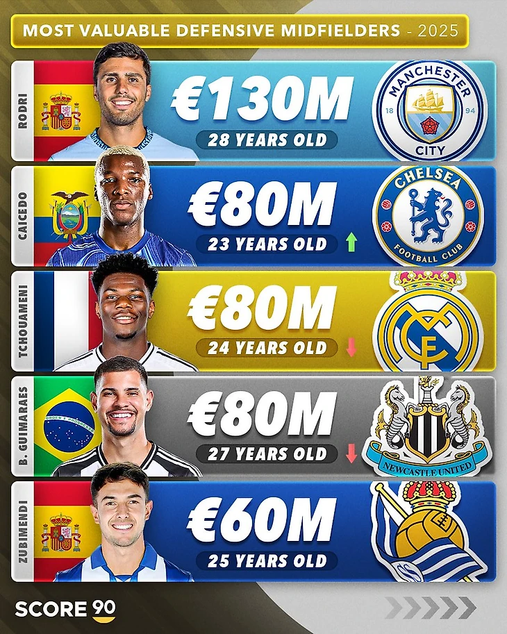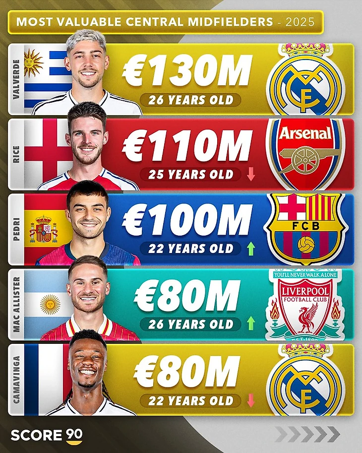 Средняя стоимость центральных полузащитников-универсалов выше, однако самый дорогой оценивается в те же 130 млн евро.