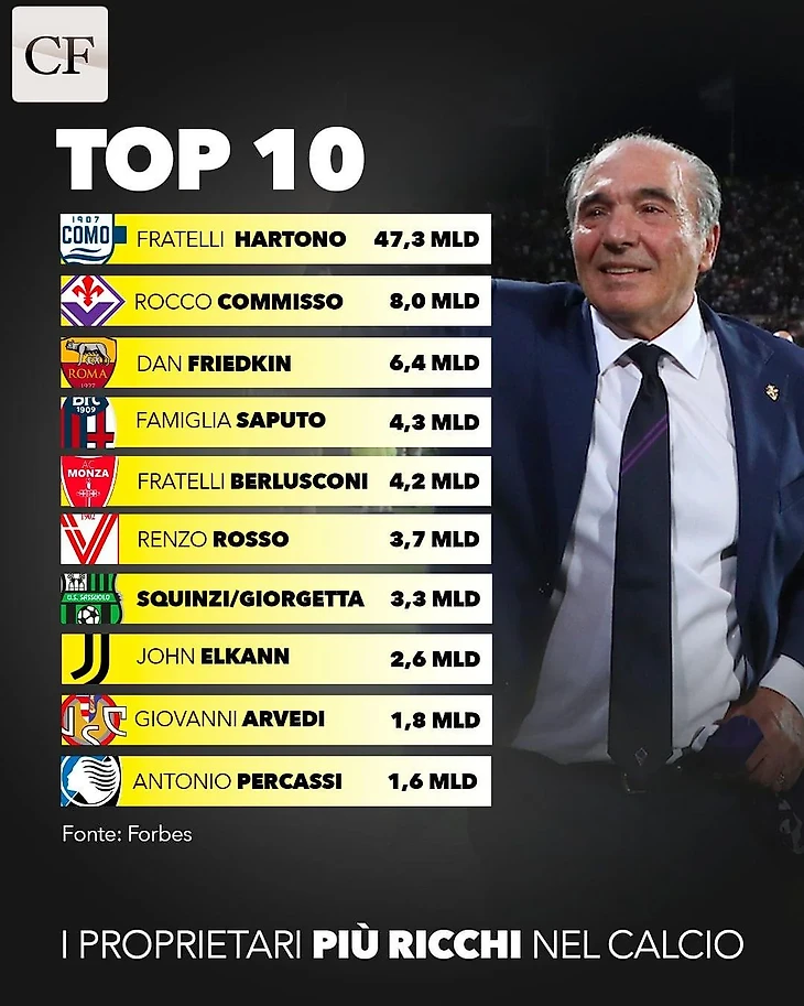 По данным Calcio e Finanza, в Серии А нет более богатых владельцев, чем братья Хартоно. Их состояние оценивают в 47,3 млрд евро. Чем они занимаются? В основном это сигаретный бизнес, но при этом у них есть банковские и продовольственные ответвления.
