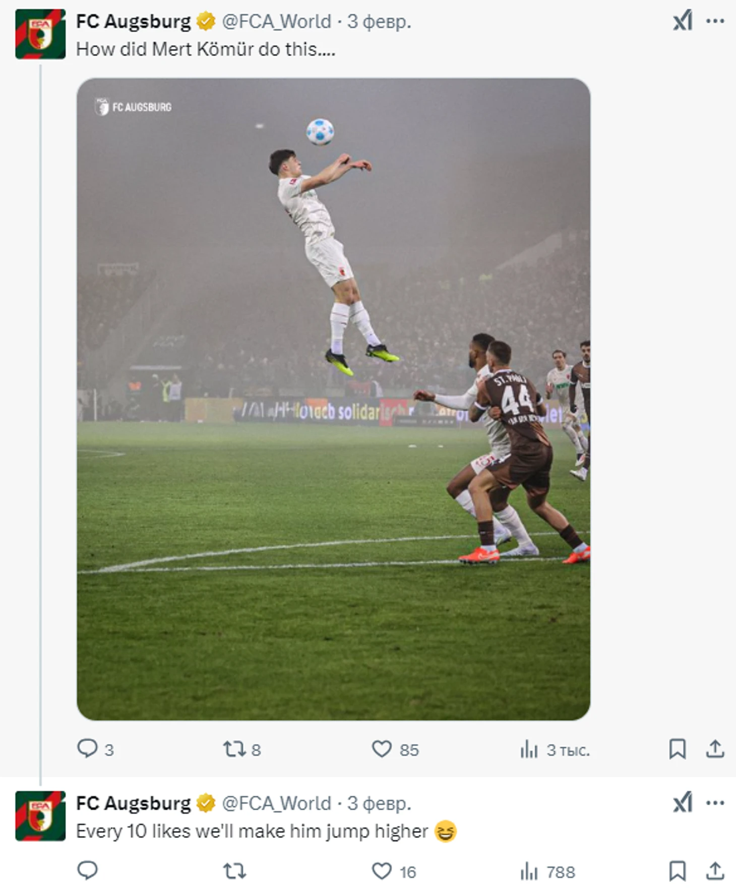 Шутка официального аккаунта «Аугсбурга» удалась: немецкий клуб предлагал увеличивать высоту прыжка за каждый десятый лайк. Так и получился снимок, который стал вирусным.