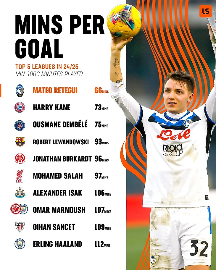 Ретеги, занявший первую строчку рейтинга, в среднем забивает каждые 66 минут. На втором месте расположился Харри Кейн – нападающему «Баварии» для гола нужно 73 минуты. Замыкает тройку лучших Усман Дембеле, который отличается каждые 75 минут.