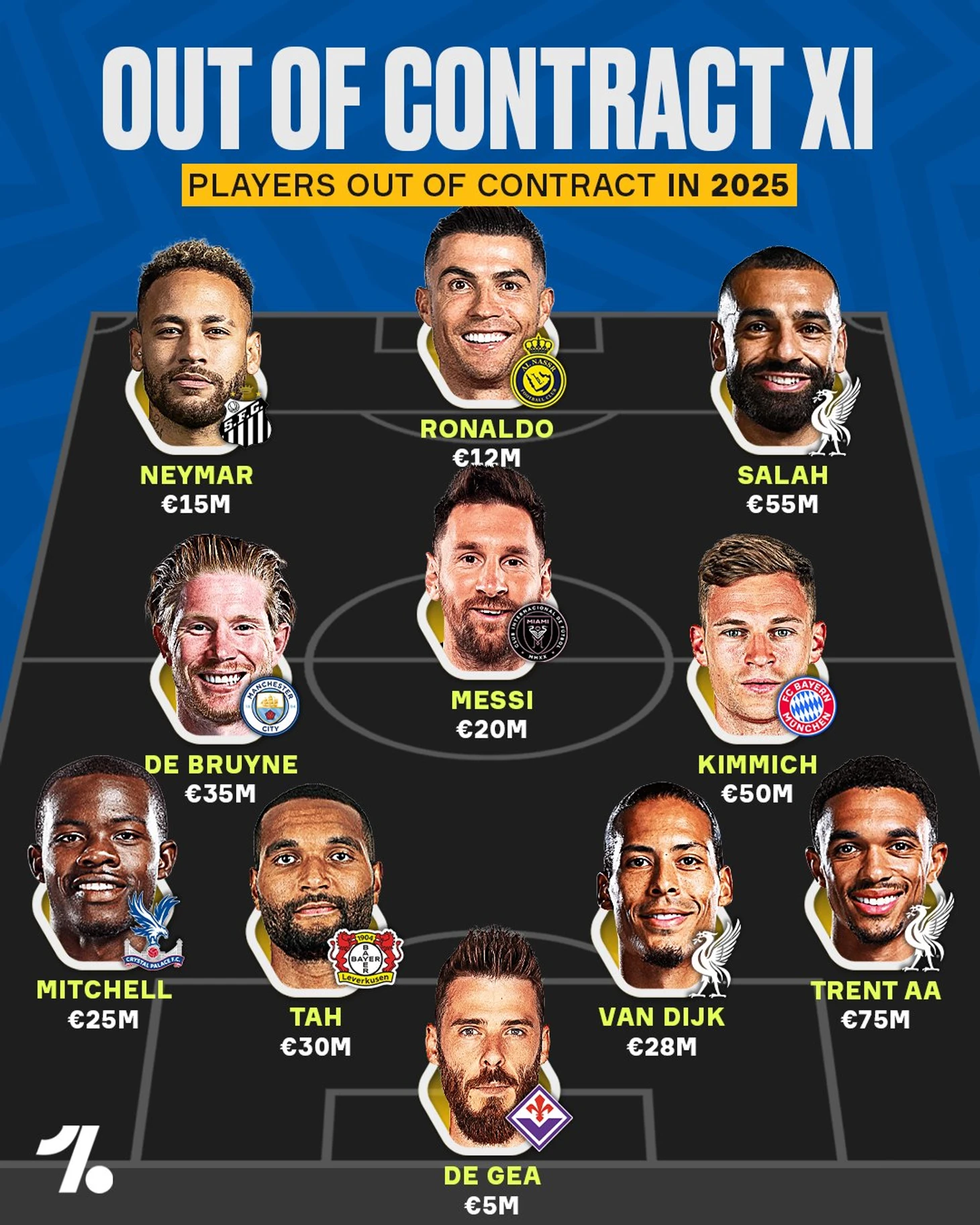 Символическая сборная игроков, чьи контракты истекают в 2025 году. Тут Месси и Роналду, дороже всех Трент 🤑