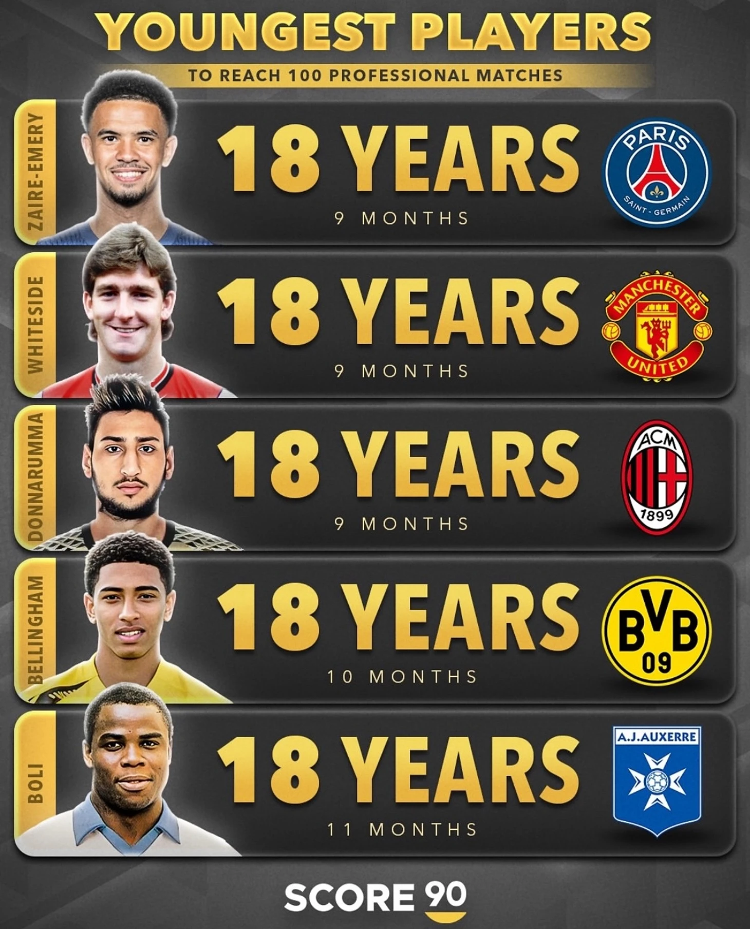 Портал Score90 вспомнил игроков, которым удалось провести 100 матчей в рекордно юном возрасте. В рейтинг попали футболисты из топ-10 чемпионатов Европы.