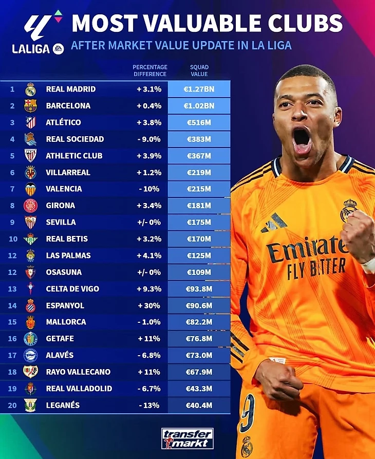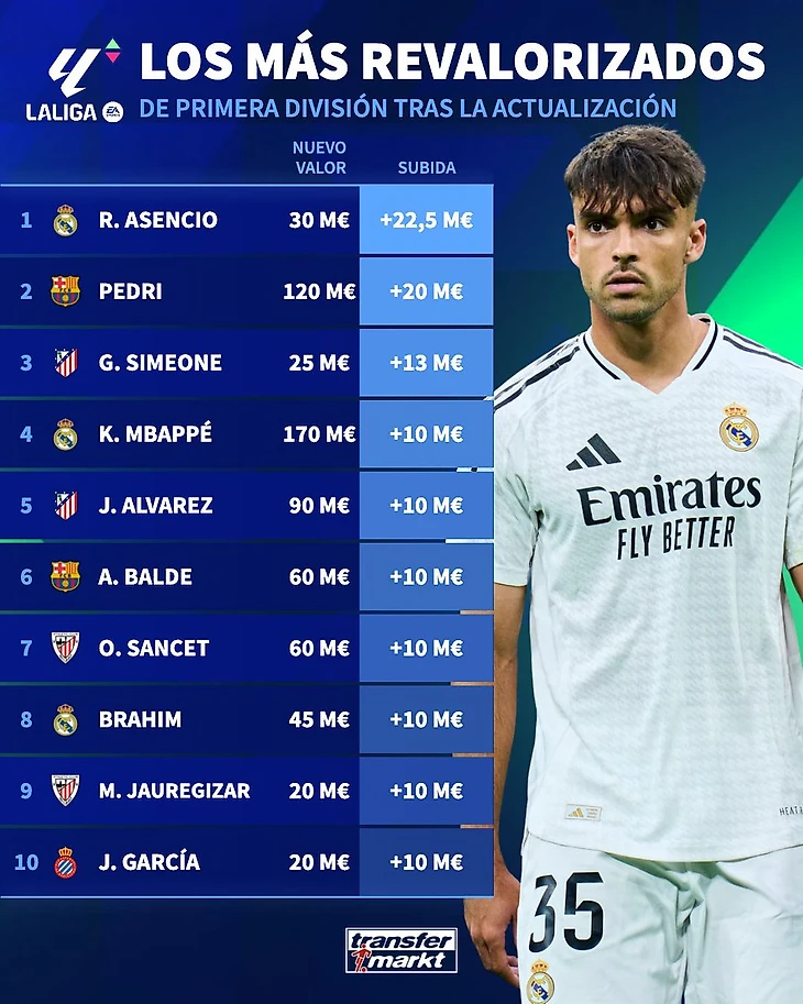 Transfermarkt использовал паузу в клубном футболе, чтобы обновить рыночную стоимость игроков Ла Лиги: в общей сложности 153 футболиста получили новые трансферные стоимости.