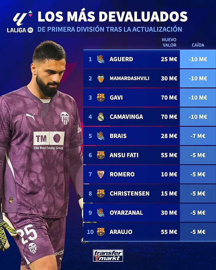Из отрицательных результатов выделяется «Реал Сосьедад», потерявший 37,7 млн ​​евро, за ним следует «Валенсия», чей состав подешевел на 25 млн евро. Обе команды – единственные, кто потерял более 10 млн после обновления: фактически, только у семи клубов снизилась общая стоимость.
