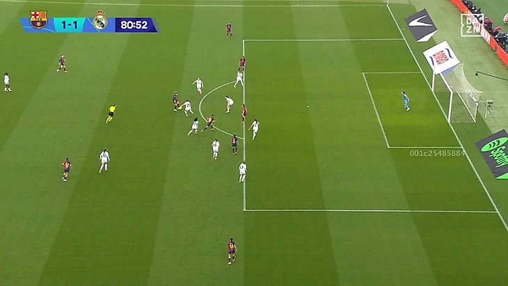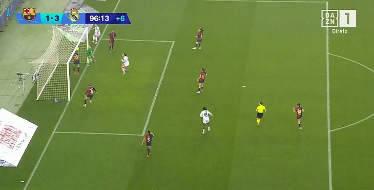 При 1:1 Яна Фернандес вывела «Барсу» вперед, но мяч не засчитали из-за офсайда. ВАР нет, пересмотреть негде. А было что: вот момент паса, после которого свистнули вне игры. Очевидно, что игрок в белом ближе к воротам.