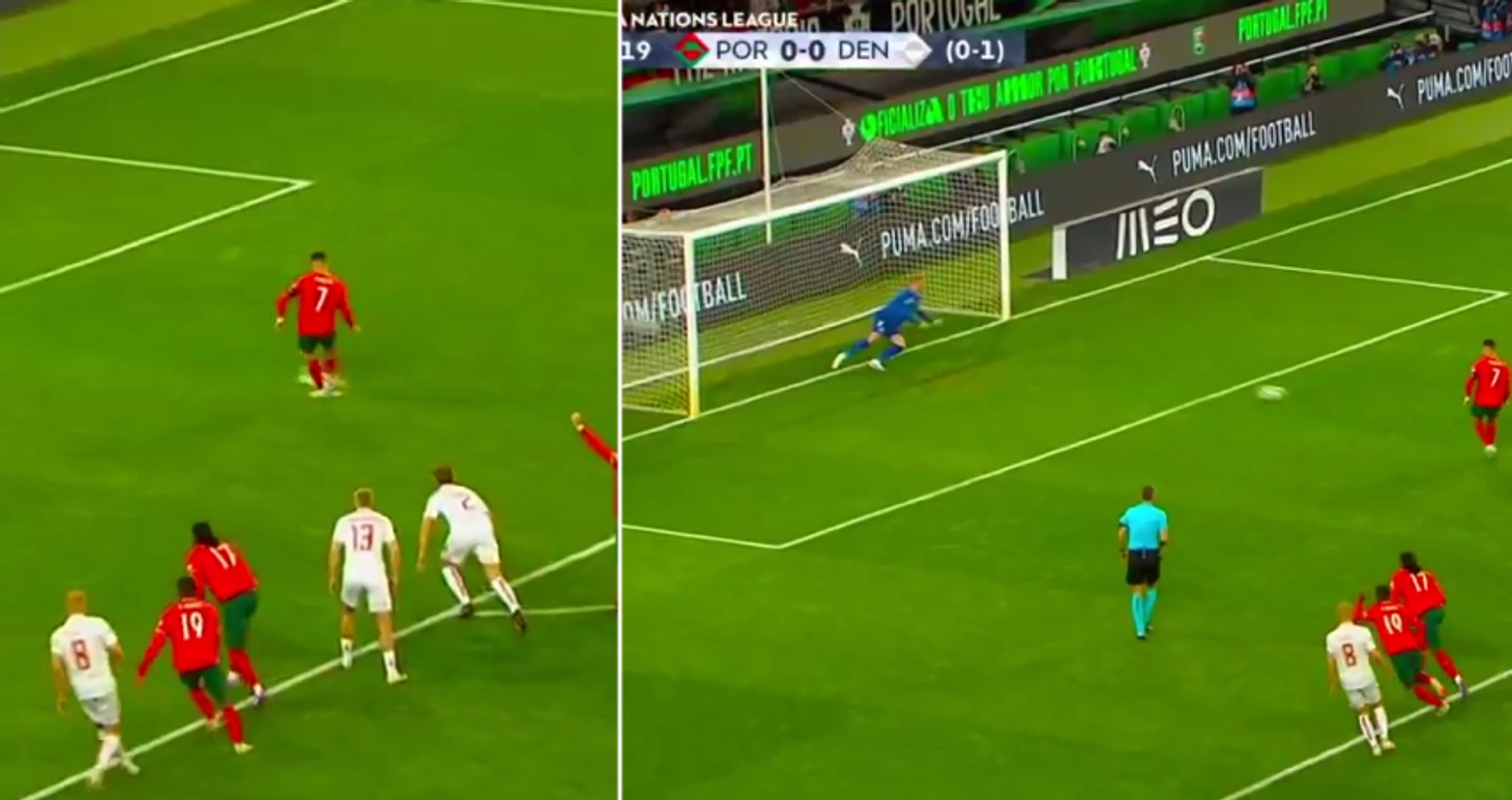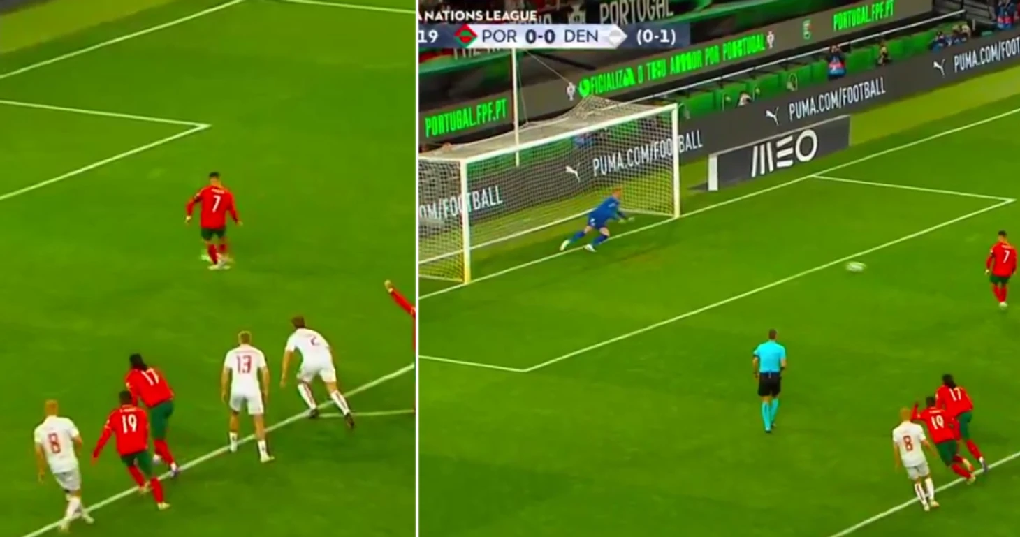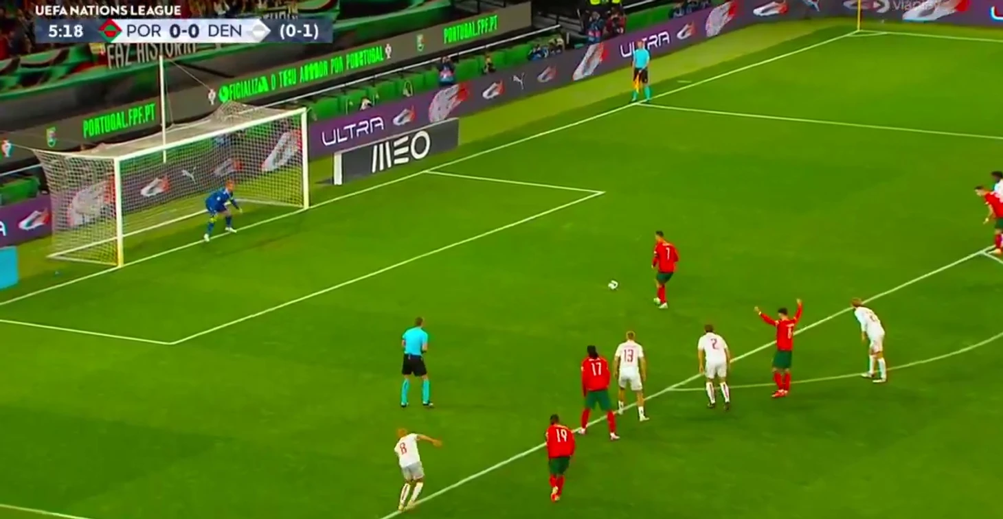 Такого удара вряд ли кто-то ждал, особенно Бруну Фернандеш, вскинувший руки еще до удара Роналду.