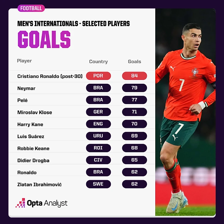 Opta решил добить нас шокирующей информацией и показала, что Криштиану Роналду по достижении 30 лет и до сегодняшнего дня забил за сборную Португалии голов больше, чем многие футбольные легенды за всю карьеру.