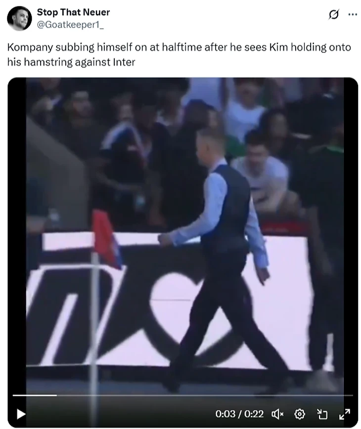 💭 «Компани в перерыве матча с «Интером» выпускает на поле самого себя, заметив, как Ким держится за подколенное сухожилие».