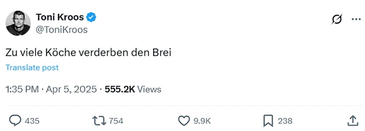 Экс-полузащитник опубликовал немецкую пословицу, аналог русского «у семи нянек дитя без глаза». В соцсетях решили, что Кроос таким образом высказался об уходе Мюллера. Тони вряд ли мог пройти мимо этой ситуации, учитывая его напряженные отношения с Рекордмайстером.