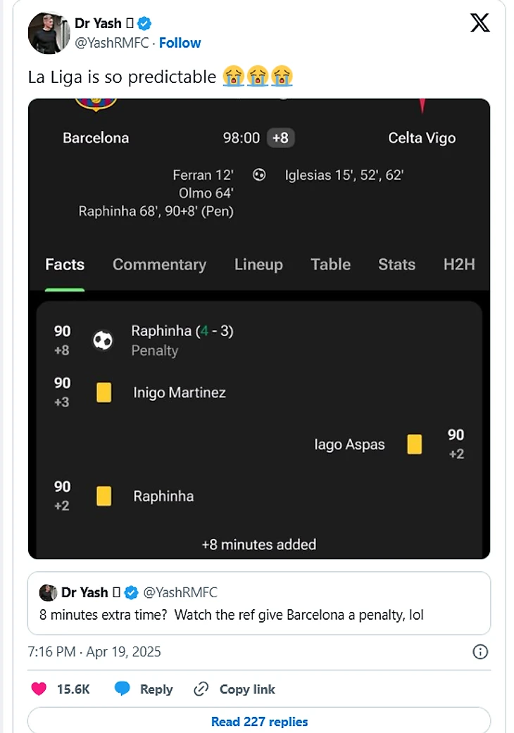 Что интересно — один из крупных фанатских аккаунтов мадридского «Реала» предсказал этот момент еще до конца игры: «8 добавленных мнут? Смотрите, сейчас реф подарит «Барселоне» пенальти. Ла Лига такая предсказуемая». Так и вышло. Как будто по сценарию.