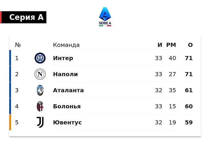 Таким образом, после 33 туров у «Наполи» и «Интера» стало равное количество очков − по 71-му.