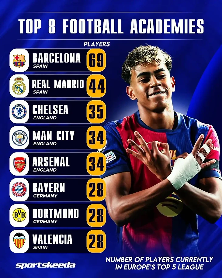 Академия «Ла Масия» не перестает быть лучшей по количеству воспитанников в топ-5 европейских лиг. На данный момент 69 выпускников «Барселоны» играют в сильнейших чемпионатах Европы.