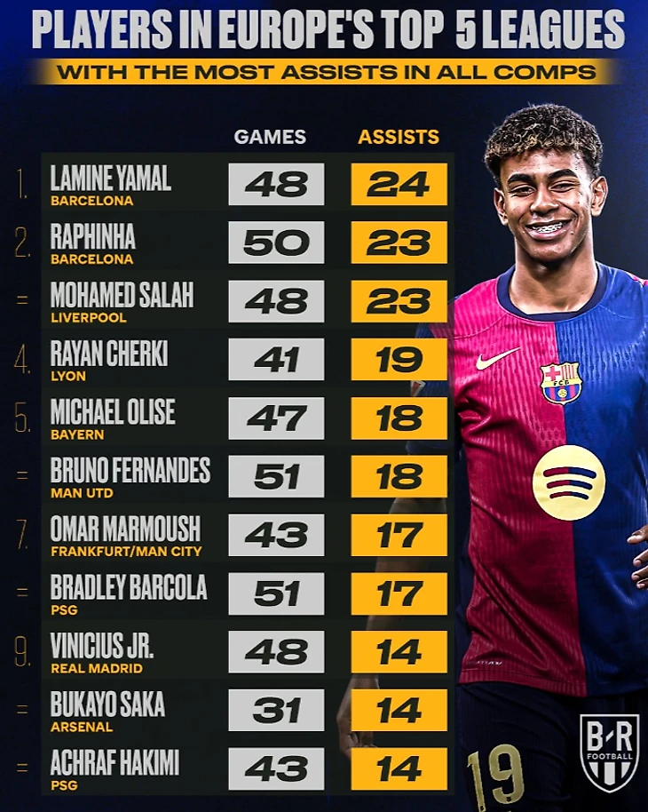В это действительно сложно поверить, но факт: 17-летний Ламин Ямаль — лучший ассистент сезона-2024/25 среди всех игроков топ-лиг.