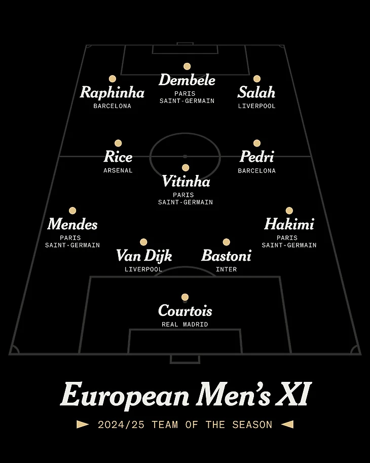 The Athletic тоже подводит итоги кампании: издание составило символическую сборную лучших футболистов в сезоне-2024/25. Наибольшее представительство у «ПСЖ», от парижан в команду попали сразу четверо: Нуну Мендеш, Витинья, Ашраф Хакими и Усман Дембеле.