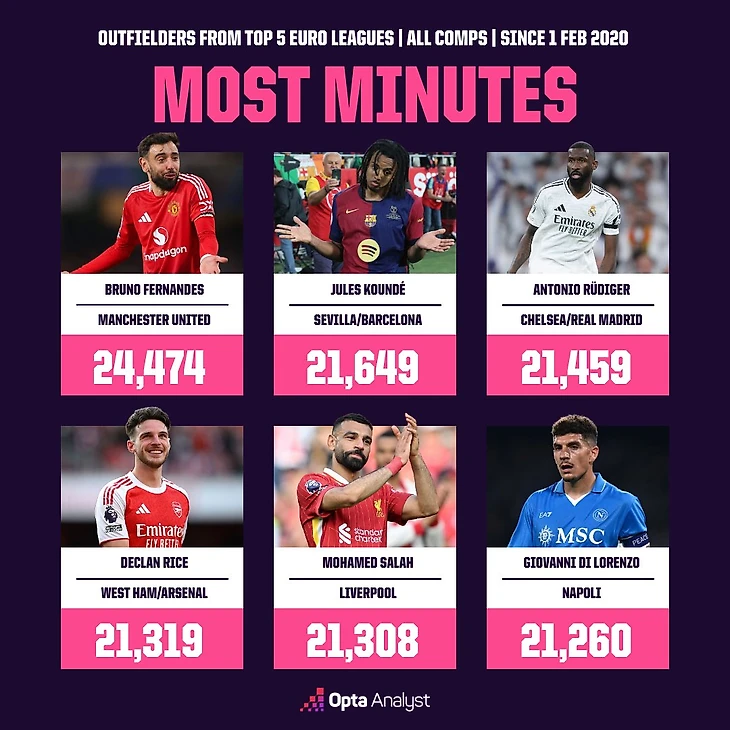 В выборку попали показатели полевых игроков из топ-5 лиг Европы, начиная с 1 февраля 2020 года. Бруну Фернандеш в рейтинге первый с отрывом: вечный португалец с момента своего перехода в «Ман Юнайтед» провел на поле 24 474 минуты – это на 2 825 минут больше, чем у Жюля Кунде, занимающего вторую строчку.