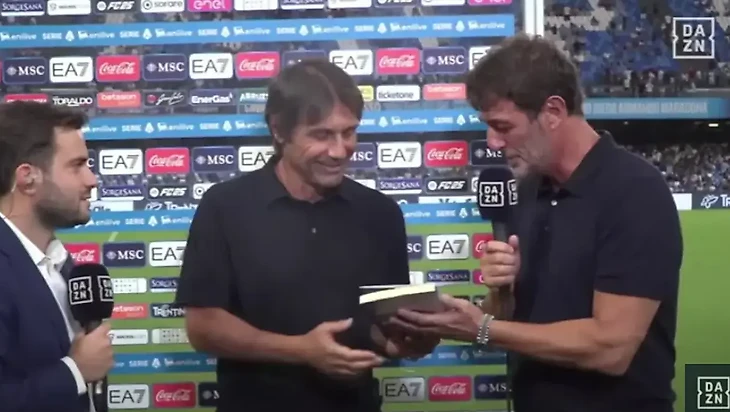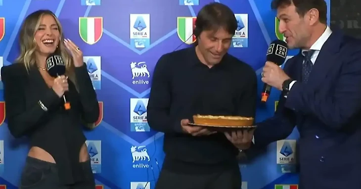 Антонио Конте в третий раз стал чемпионом Италии. В этот раз он выиграл скудетто вместе с «Наполи». После матча он пришел во флешзону DAZN, где его ожидала Дилетта Леотта и неожиданный подарок от экс-игрока клуба.
