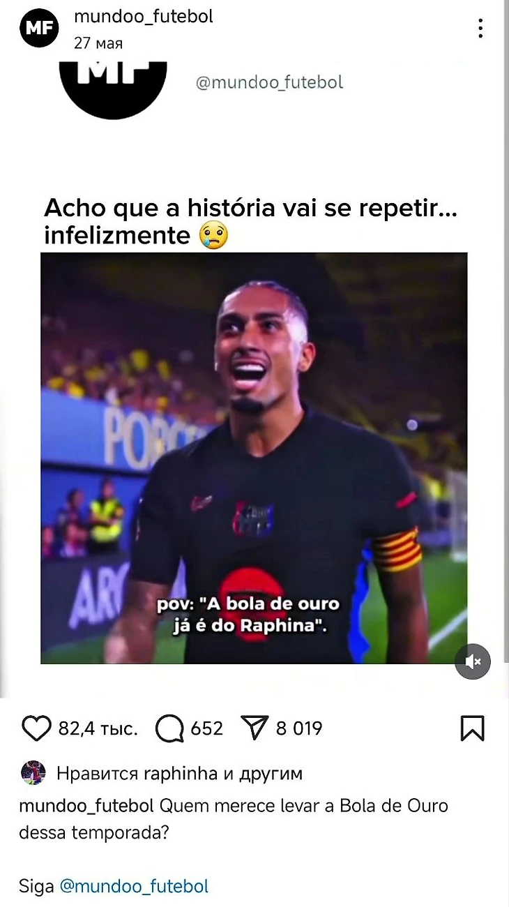 Кажется, что эта тема очень волнует бразильцев. Издание O Mundo do Futebol в социальных сетях разместило видео, с нарезкой моментов из игры Винисиуса Жуниора, Неймара и Рафиньи Диаса. Надпись гласит: «Думаем, история, к сожалению, повторится». Имея в виду, что и в этом году индивидуальная награда достанется вновь не бразильцу.