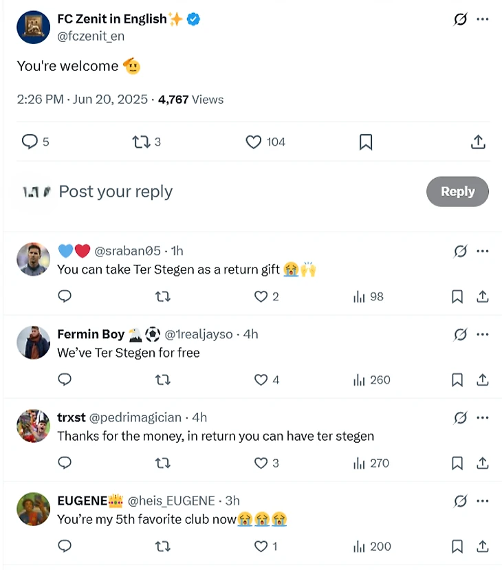 Фанатский аккаунт «Барсы» в X запостил новость о донате «Зенита», в комменты пришел англоязычных аккаунт «сине-бело-голубых»: «Не за что 🫡».