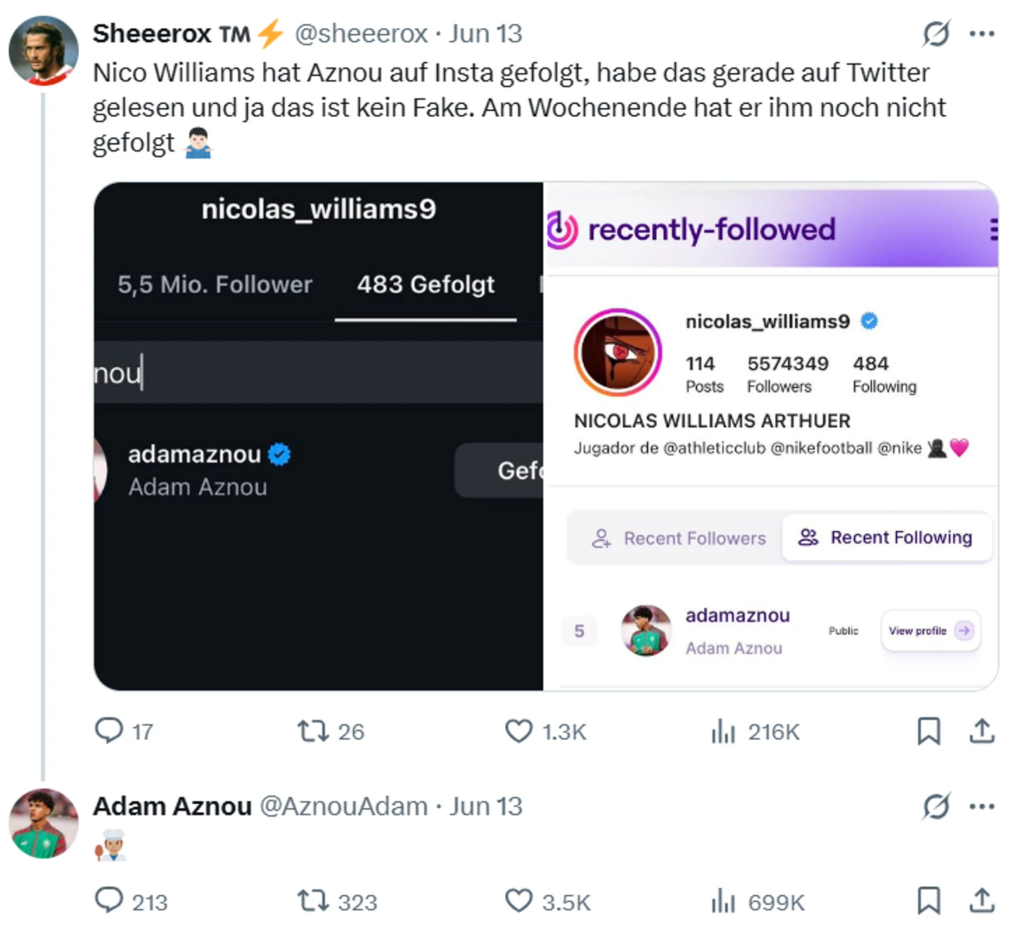 В какой-то момент историю про скорый трансфер Нико в «Баварию» начали разгонять и футболисты мюнхенцев. Уильямс в соцсетях обменялся подписками с Адамом Азну, выпускником Ла Масии. Когда об этом написал фанатский аккаунт, Азну оставил под постом эмодзи повара.