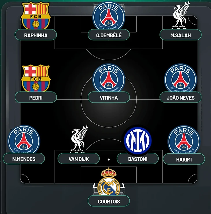 Рабочей схемой выбрали 4-3-3 и вот кто в ней оказался: Тибо Куртуа («Мадрид») − Нуну Мендеш («ПСЖ»), Вирджил ван Дейк («Ливерпуль»), Алессандро Бастони («Интер»), Ашраф Хакими («ПСЖ») − Педри («Барселона»), Витинья («ПСЖ»), Жоау Невеш («ПСЖ») − Рафинья Диас («Барселона»), Усман Дембеле («ПСЖ»), Мохамед Салах («Ливерпуль»).