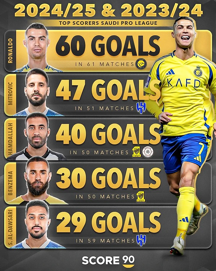 Первое место предсказуемо у Криштиану Роналду, который за 61 матч в «Аль-Насре» забил 60 голов. Далее идет Александар Митрович из «Аль-Хилаля» − 47 мяч в 51 игре. Третье место у представителя «Аль-Иттихада» Абдерразака Амдаллы − 40 голов в 50 матчах. Именно он был лучшим бомбардиром команды до прихода Карима Бензема, у которого 30 голов в 50 матчах, но 21 из них он забил в сезоне-2024/25. Закрывает пятерку еще один игрок «Аль-Хилаля» − Салем Аль-Досари (59 матчей и 29 голов).