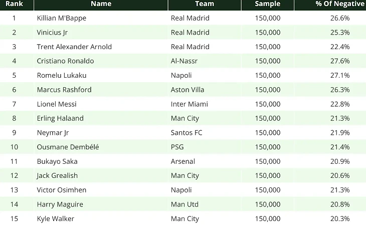 Килиан Мбаппе — один из лидеров антирейтинга: 26,3% комментариев в его адрес в соцсетях были негативными или оскорбительными. Следом — Винисиус Жуниор с 25,3% подобных сообщений. В пятерку попал и Трент Александер-Арнольд — 22,4% комментариев в его адрес также носили оскорбительный характер.