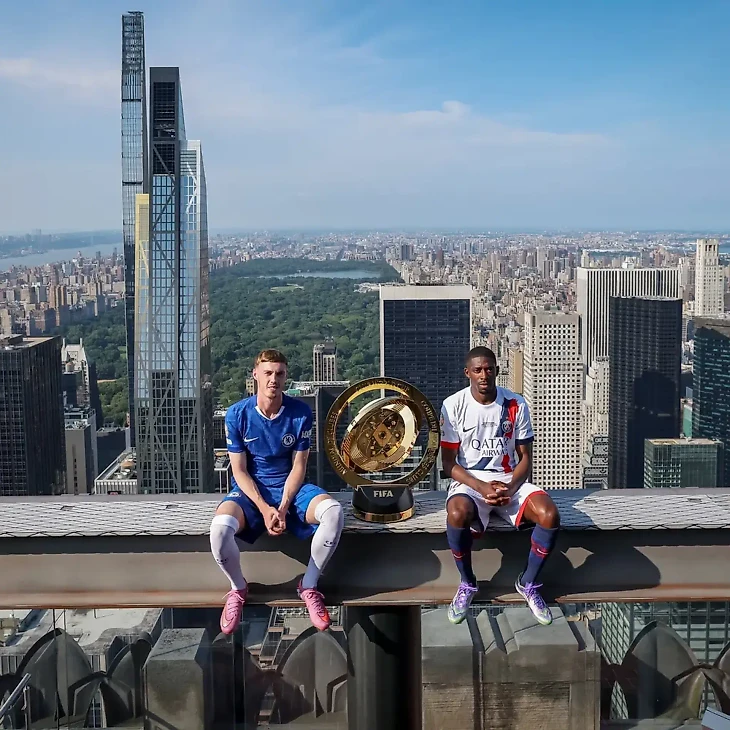 Коул Палмер и Усман Дембеле — главные звезды своих команд на этом турнире — встретились на высоте (верим?), чтобы провести фотосессию с видом на Центральный парк и Кубок Клубного чемпионата мира.