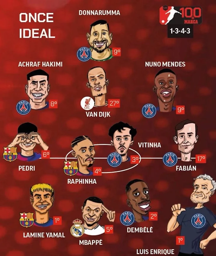 🎥 Marca креативно представила сборную сезона – в виде шаржей на игроков. В команде доминирует «ПСЖ»