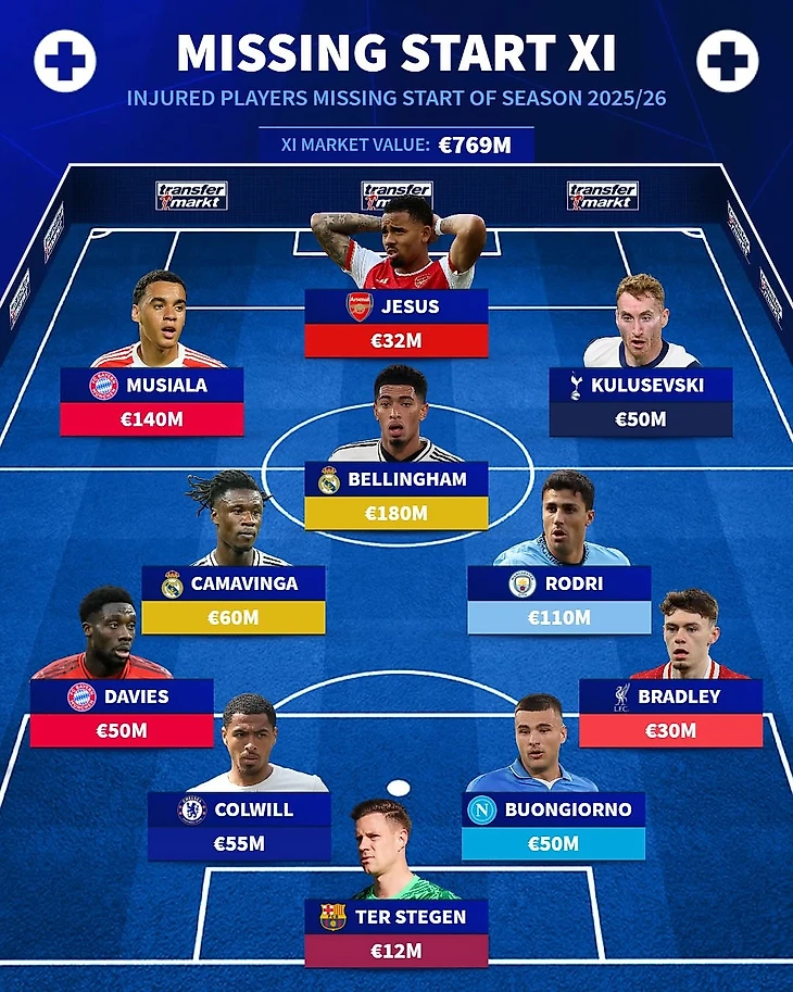 В сборную также попали Алессандро Буонджорно и настрадавшийся Марк-Андре тер Стеген. За такой состав травмированных пришлось бы выложить почти 800 млн евро.