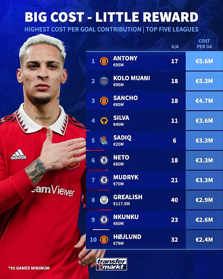 Возглавил рейтинг вингер «МЮ» Антони. Клуб заплатил за него 95 млн евро, а взамен получил всего 17 очков по системе «гол плюс пас» во всех турнирах. Столько же получил «Айнтрахт» от «ПСЖ» за Рандаля Коло-Муани, но он сообразил 18 очков. Меньше потратил все тот же «МЮ» на Джейдона Санчо – 85 млн и 18 результативных действий.