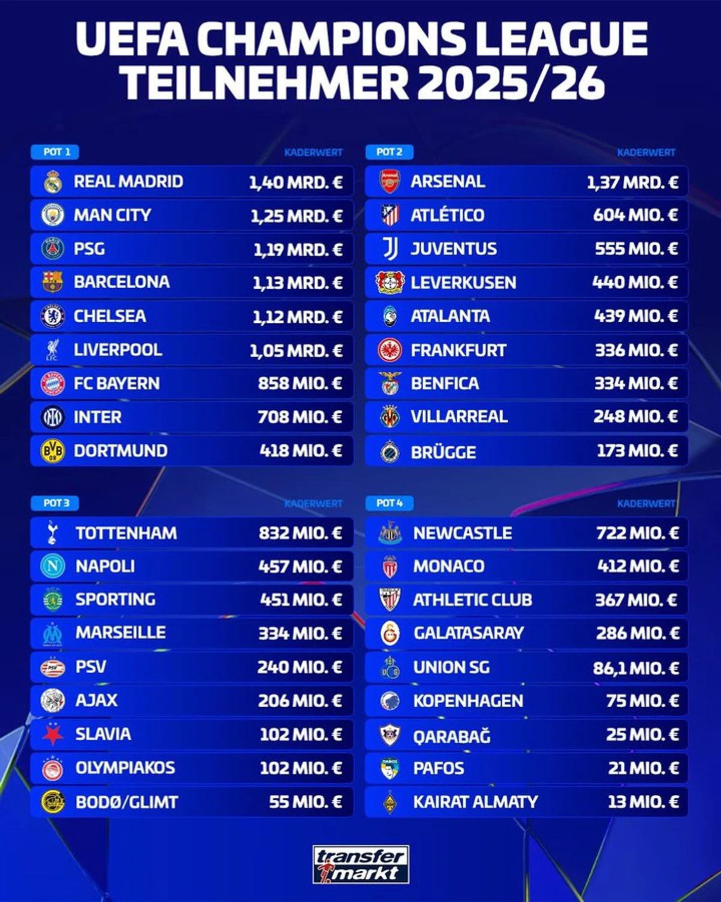 Как обычно, Transfermarkt первый отреагировал на итоги последнего квалификационного раунда Лиги чемпионов, который определил то, как будут выглядеть четыре корзины перед жеребьевкой. Следом появилась таблица стоимости составов всех участвующих команд.
