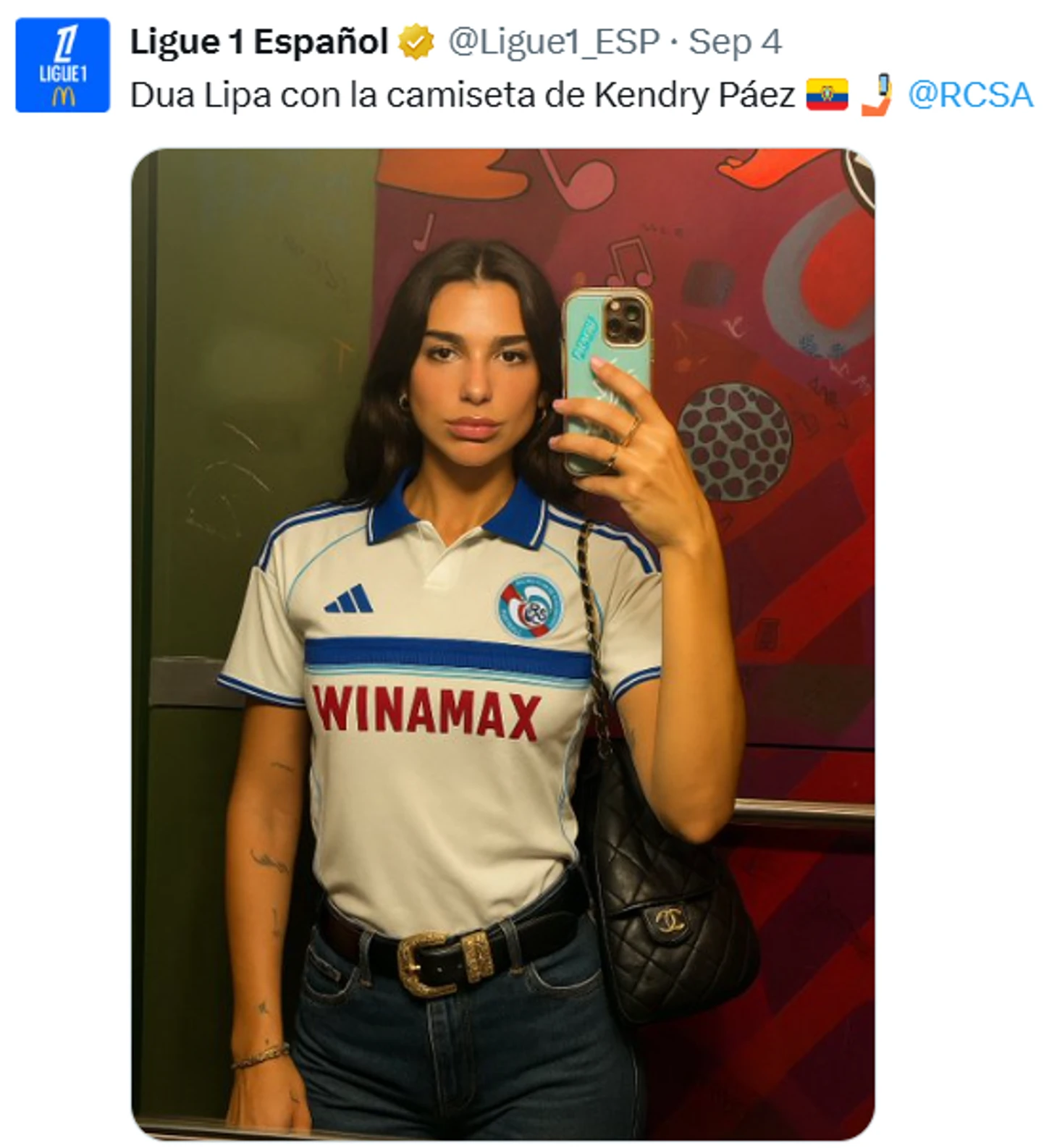 Испаноязычный аккаунт Лиги 1: «Дуа Липа в футболке Кендри Паеса [новичок «Страсбура»].