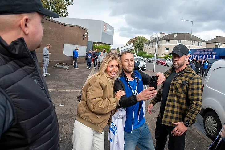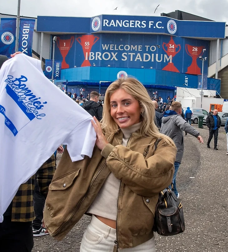 26-летняя девушка прибыла незадолго до начала матча «Рейнджерс» с «Хартс», ее Bang Bus окружили болельщики. Сотни молодых людей подошли к фургону, где Бонни Блю позировала для селфи и раздавала футболки.