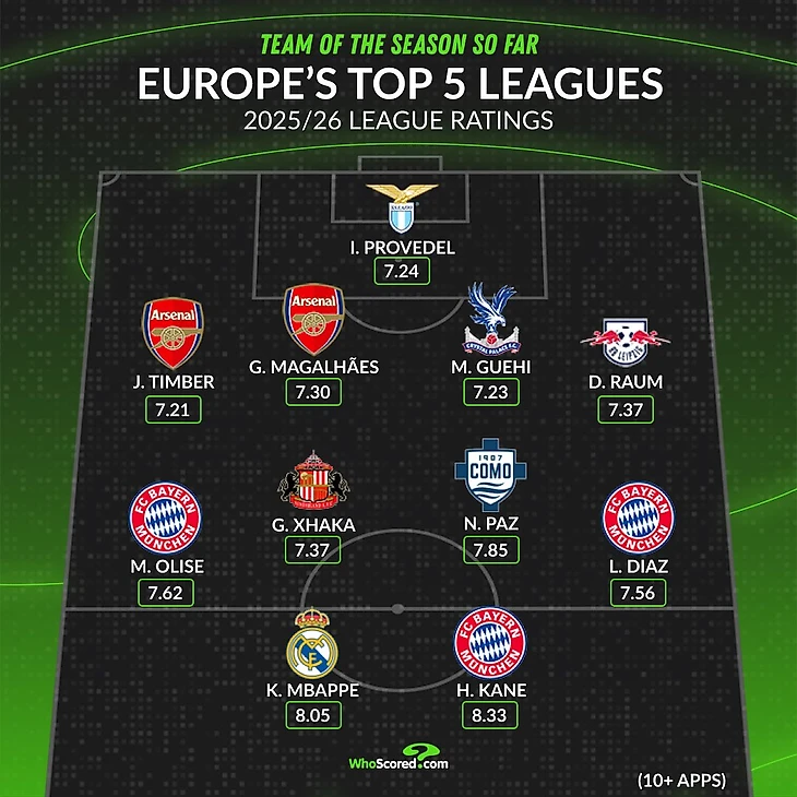 У «Баварии» самое внушительное представительство в команде от WhoScored, компанию Кейну составили Майкл Олисе и Луис Диас. Несколько представителей и у «Арсенала» – Юрриен Тимбер и Габриэл Магальяэс. В сборную также вошли Иван Проведель, Марк Гехи, Давид Раум, Гранит Джака, Нико Пас и Килиан Мбаппе.