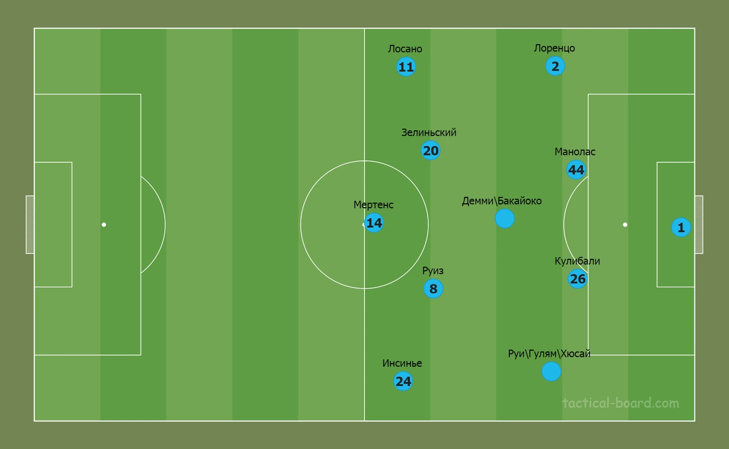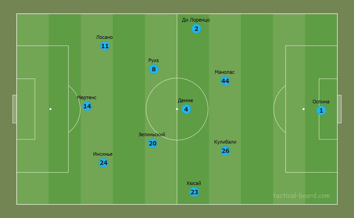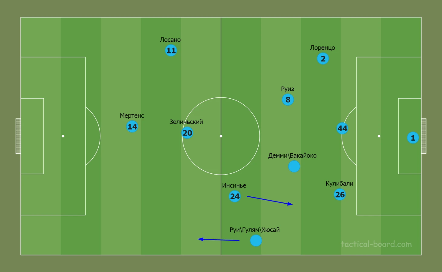 Инсинье спускается практически на место левого фулбека, который уходит высоко вперед на уровень Зелиньского. С другого края немного опускается Ди Лоренцо, образуя тройку защитников. В таких ситуациях структуру можно описать как -  1-3-3.