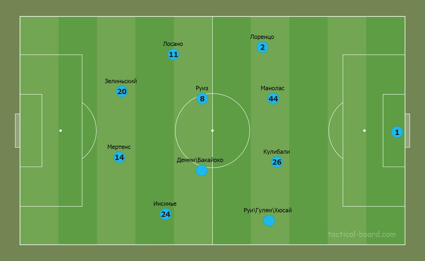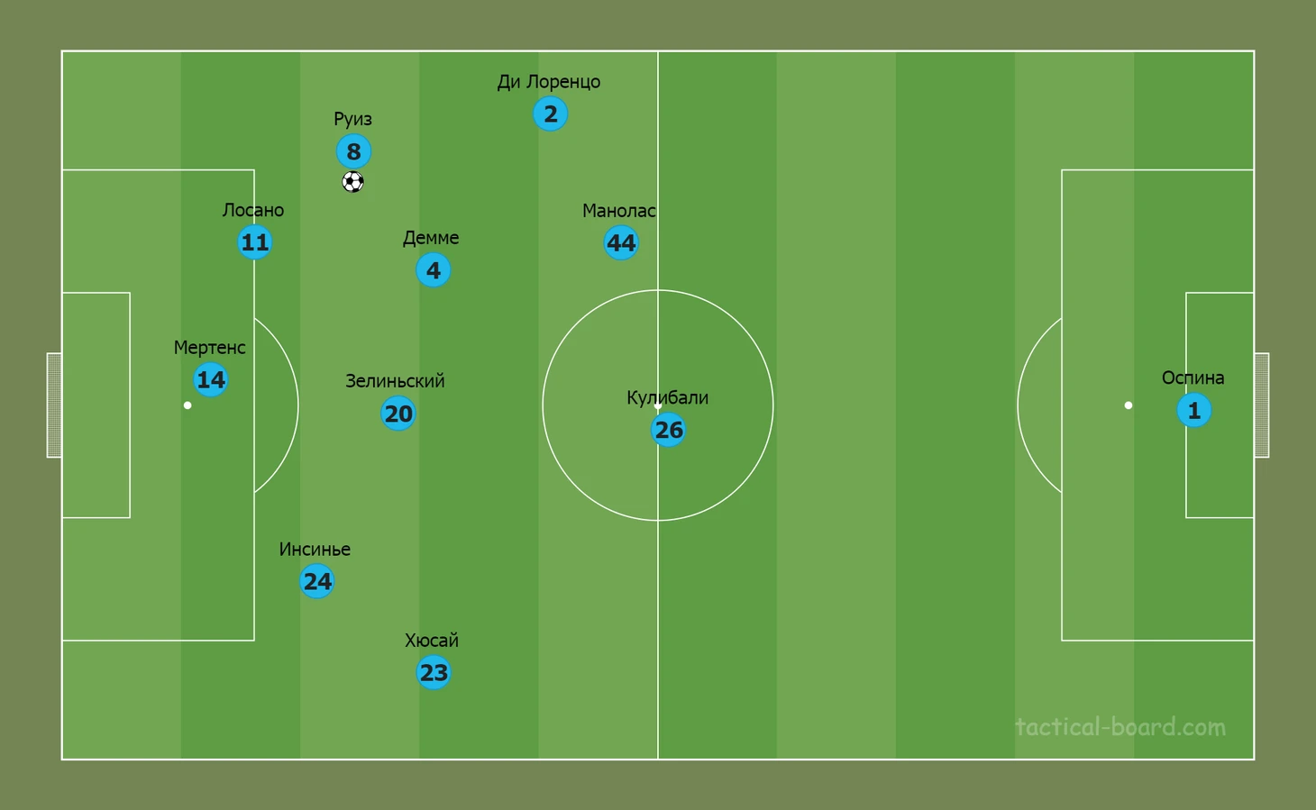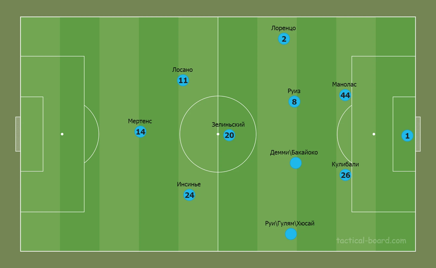 Инсинье спускается практически на место левого фулбека, который уходит высоко вперед на уровень Зелиньского. С другого края немного опускается Ди Лоренцо, образуя тройку защитников. В таких ситуациях структуру можно описать как -  1-3-3.