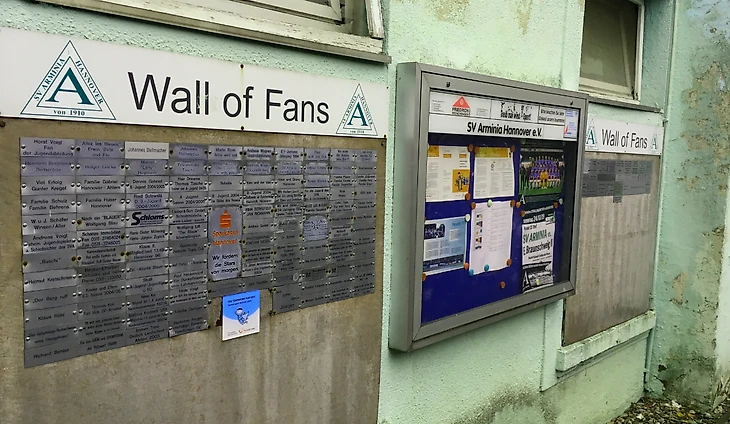 На внешней стене трибуны «Арминия» вывесила имена самых преданных болельщиков – интересная находка от небольшого клуба. А может, это не самые преданные болельщики, а вообще все болельщики.