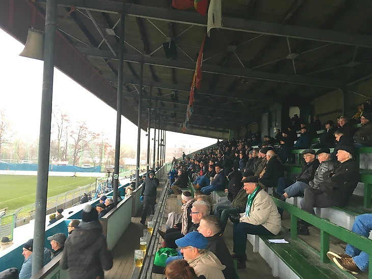 Cтадион Рудольфа Кальтвайта вмещает 10 тысяч зрителей, сидячих мест при этом меньше половины. В этом году арена отметила свое столетие и даже не пытается молодиться, поэтому инфраструктура очень напоминает антураж нашей первой лиги из девяностых – подуставшая центральная трибуна с козырьком и деревянными скамейками и вмонтированные в насыпные холмы бетонные сидушки, которыми по назначению никто не пользовался уже лет 50.