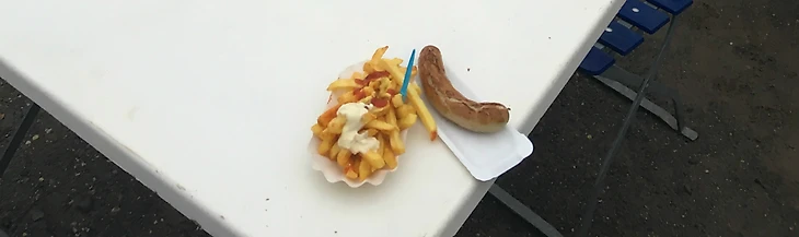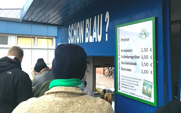 Киоск с закусками гордо хвалился статьей в популярном немецком футбольном журнале «11 Freunde». Согласно цитате с плаката, в номере за сентябрь 2014 года журналисты назвали стадион Рудольфа Кальтвайта «тихим местечком, где можно наслаждаться футболом без всякой отвлекающей белеберды, закусывая одними из лучших в регионе сосисок». Еще киоск играл словами фразы «Schon blau?» (уже синий?). С одной стороны, синий – цвет «Арминии», с другой стороны синими в Германии (и не только) называют пьяных. По обеим причинам на поставленный вопрос я ответил положительно. Что имелось ввиду под «отвлекающей белебердой», я так и не понял.