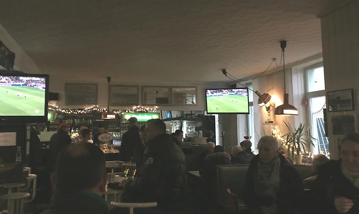 Дальше – клубный бар прямо в трибуне. Там своя атмосфера, показывают матч «Санкт-Паули» – и посетители вообще возможно не в курсе, что снаружи играют в футбол.