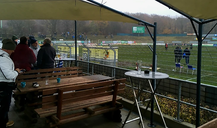 Напитки нельзя забирать с собой на трибуну, зато с ними можно выходить на веранду, которая на деле еще лучше трибун. Тут столики, козырьки и скорее всего очень круто летом. А еще тут отлично слышно тренеров обеих команд и их общение с, например, судьями – оскорбляют бедняг с флажками в Германии точно не меньше, чем у нас.