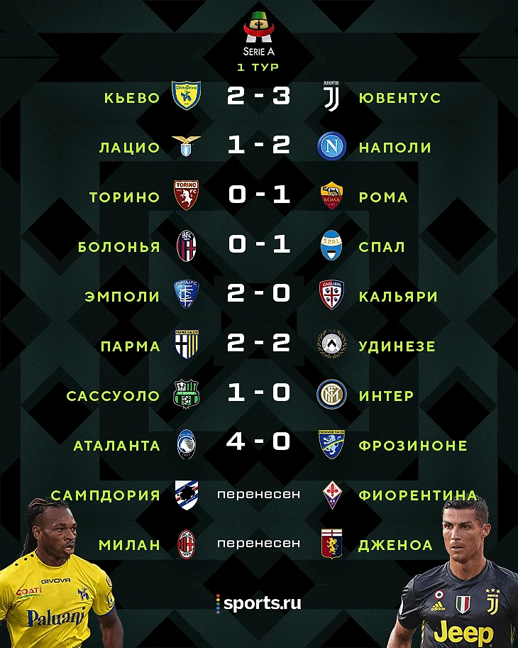 • Два матча были перенесены из-за трагедии в Генуе, где обрушившийся мост унес жизни более трех десятков человек. «Сампдория» и «Фиорентина» сыграют 19-го сентября, «Милан» и «Дженоа» – 31-го октября.