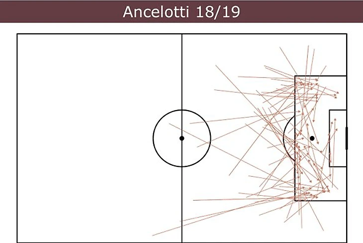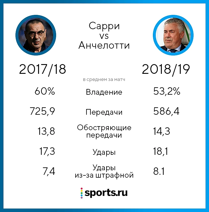 Изменился и стиль «Наполи». С «Сассуоло» «адзурри» отдали сопернику контроль над мячом – при предыдущем тренере такое представить было сложно. «Наполи» Сарри в среднем владел мячом 60% игрового времени, «Наполи» Анчелотти – 53,2% - это шестой показатель в серии А. Теперь неаполитанцы делают примерно на 150 пасов за матч меньше, зато чаще бьют (в среднем 18 ударов против 15). Команда значительно чаще бьет из-за пределов штрафной (8,1/7,4) количество обостряющих пасов только выросло (14,3 против 13,8).