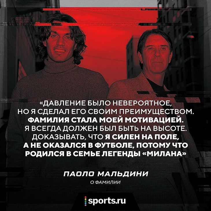«Ярлык «Сын Чезаре» я носил до попадания в первую команду, – говорит Паоло. – Играл только потому, что был сыном Мальдини. Так говорили соперники и даже родители некоторых одноклубников. Я не хочу, чтобы мои дети тоже это пережили. В современном футболе, со спонсорами и агентами все еще сложнее. Я беру пример с отца. Наблюдаю за ними, но не достаю. Для меня не имеет значения, станут они известными футболистами или скоро бросят спорт. Важно, чтобы они были счастливы».