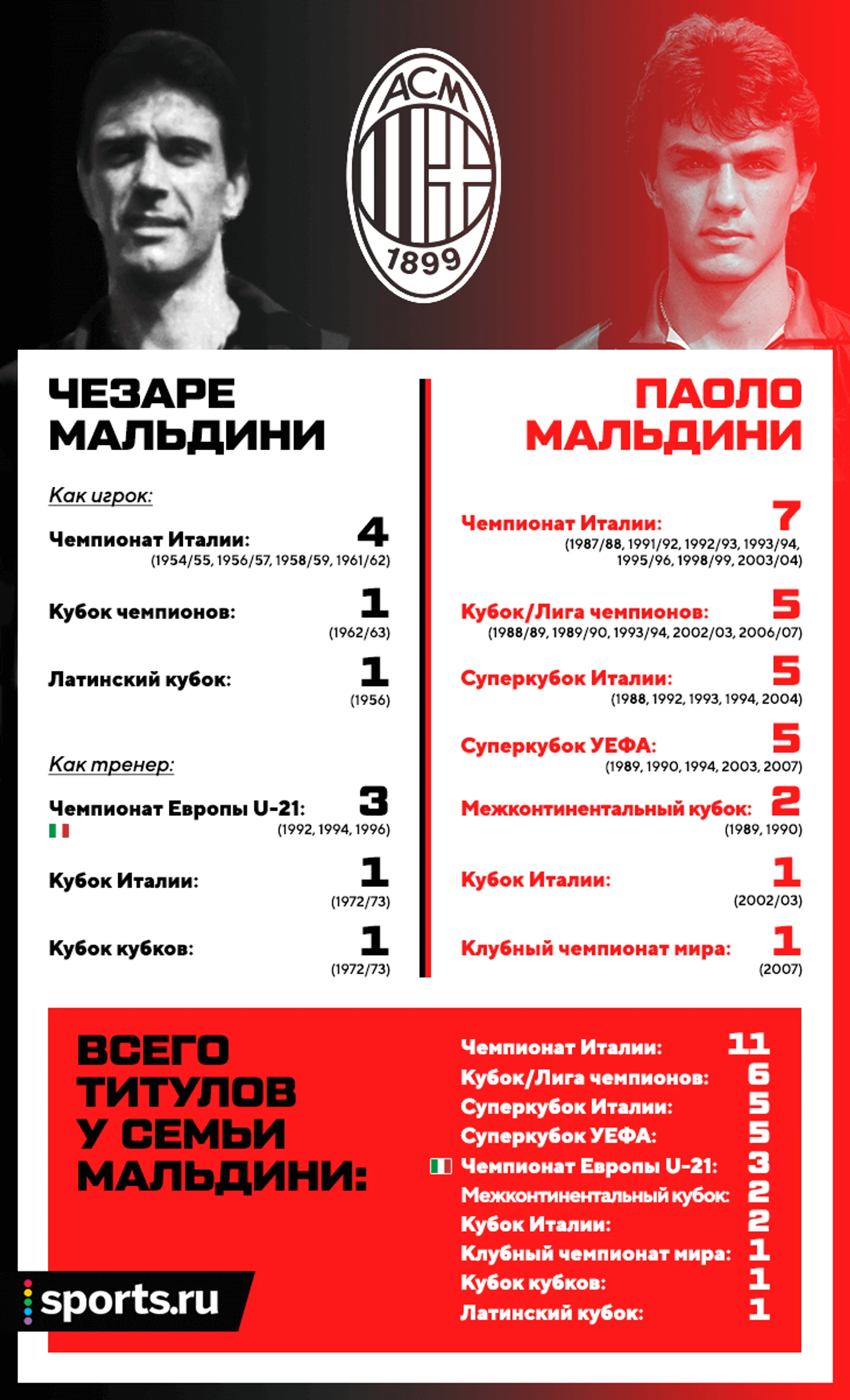 Чезаре не преувеличивал. Он отыграл за «россонери» 14 лет, в 1963-м став капитаном первой итальянской команды, которая взяла Кубок чемпионов. Паоло выступал в красно-черных цветах 25 лет (еще семь – в молодежках) и установил множество клубных рекордов, среди которых 647 матчей в серии А и 902 игры во всех турнирах. Статистики и количества трофеев (у Чезаре и Паоло их 37 на двоих) достаточно, чтобы осознать масштаб величия семьи Мальдини, но слова важнее холодных цифр.