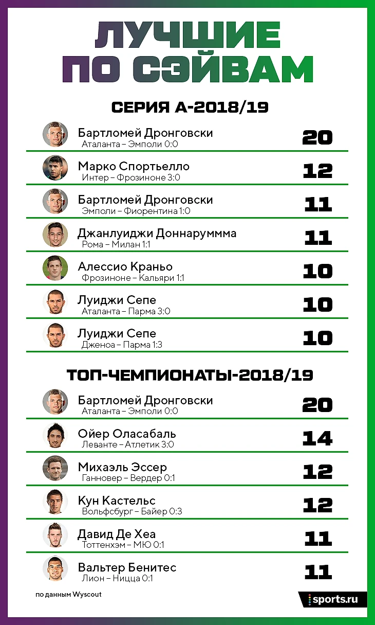 11 сэйвов за матч – третий результат в нынешнем чемпионате Италии. Рекорд тоже принадлежит 21-летнему Дронговскому. За три недели до матча против «Фиорентины» «Эмполи» играл с «Аталантой». Бергамаски нанесли 43 удара по воротам, показатель ожидаемых голов составил невероятные 6,39, но игра завершилась нулевой ничьей. Дронговски сделал то ли 17 (по данным Opta), то ли 20 сэйвов (по подсчетам Wyscout). В любом случае – это лучший перфоманс вратаря в серии А за 15 лет, с тех пор, как ведется подобная статистика.