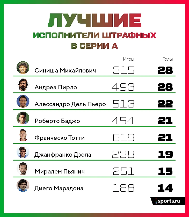 Синиша даже вызывал Пирло на состязание. «Я готов. По десять штрафных. Посмотрим, кто забьет больше. Пусть выбирает мяч и вратаря», – заявил серб в январе 2014-го. Пирло не отреагировал.