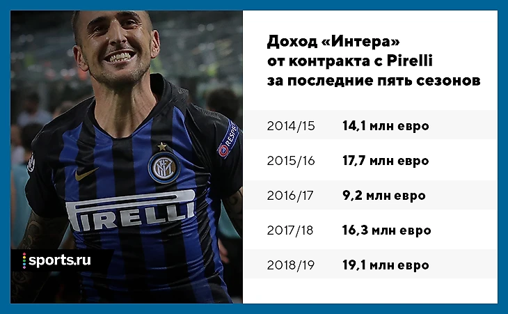 По контракту Pirelli платит клубу 10,5 млн за сезон, но сумма выросла благодаря бонусам за участие в Лиге чемпионов. Среди клубов Серии А у «Интера» пятое по величине соглашение с титульным спонсором (без учета бонусов). Больше зарабатывают «Сассуоло» (18 млн, президент Джорджо Сквинци спонсирует свой же клуб), «Ювентус» (17 млн от Jeep), «Милан» и «Рома» (по 14 млн от Emirates и Qatar Airways & Hyundai).