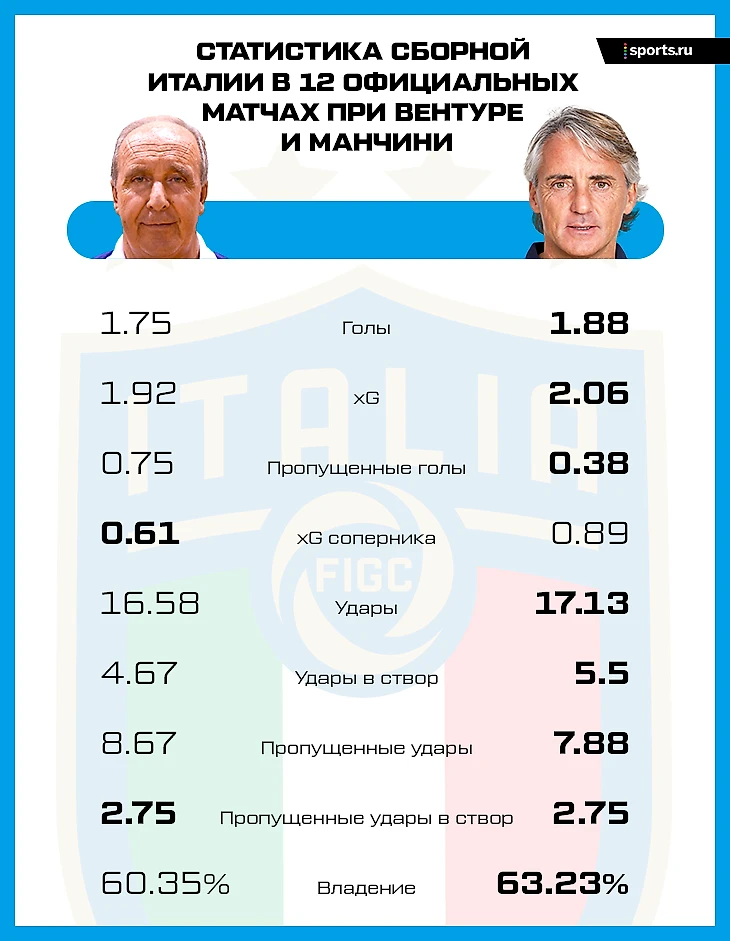 С Манчини Италия сыграла 12 официальных матчей, как и с Вентурой. Прибавила во всем
