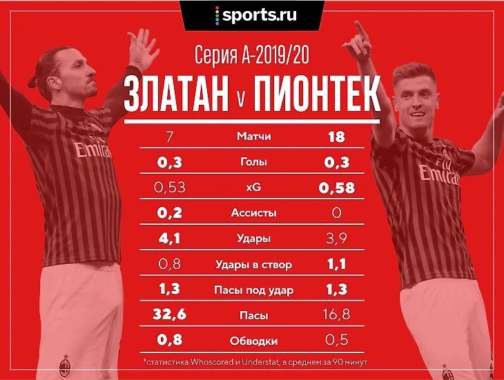 За семь матчей в чемпионате Златан забил дважды: «Кальяри» в первом матче в основе и в дерби «Интеру». Скромная статистика, но Пиоли все равно говорит, что Ибрагимович так же важен для его команды, как Роналду для «Ювентуса», Иммобиле для «Лацио» и Лукаку для «Интера». В завершении атак Златан мало в чем превосходит Пионтека первой половины сезона – примерно столько же бьет по воротам и пасует под удар, реже попадает в створ. Ключевое отличие – в количестве передач, их у Ибрагимовича в два раза больше. Появление шведа кардинально изменило стиль «Милана», и это повлияло на результаты команды.